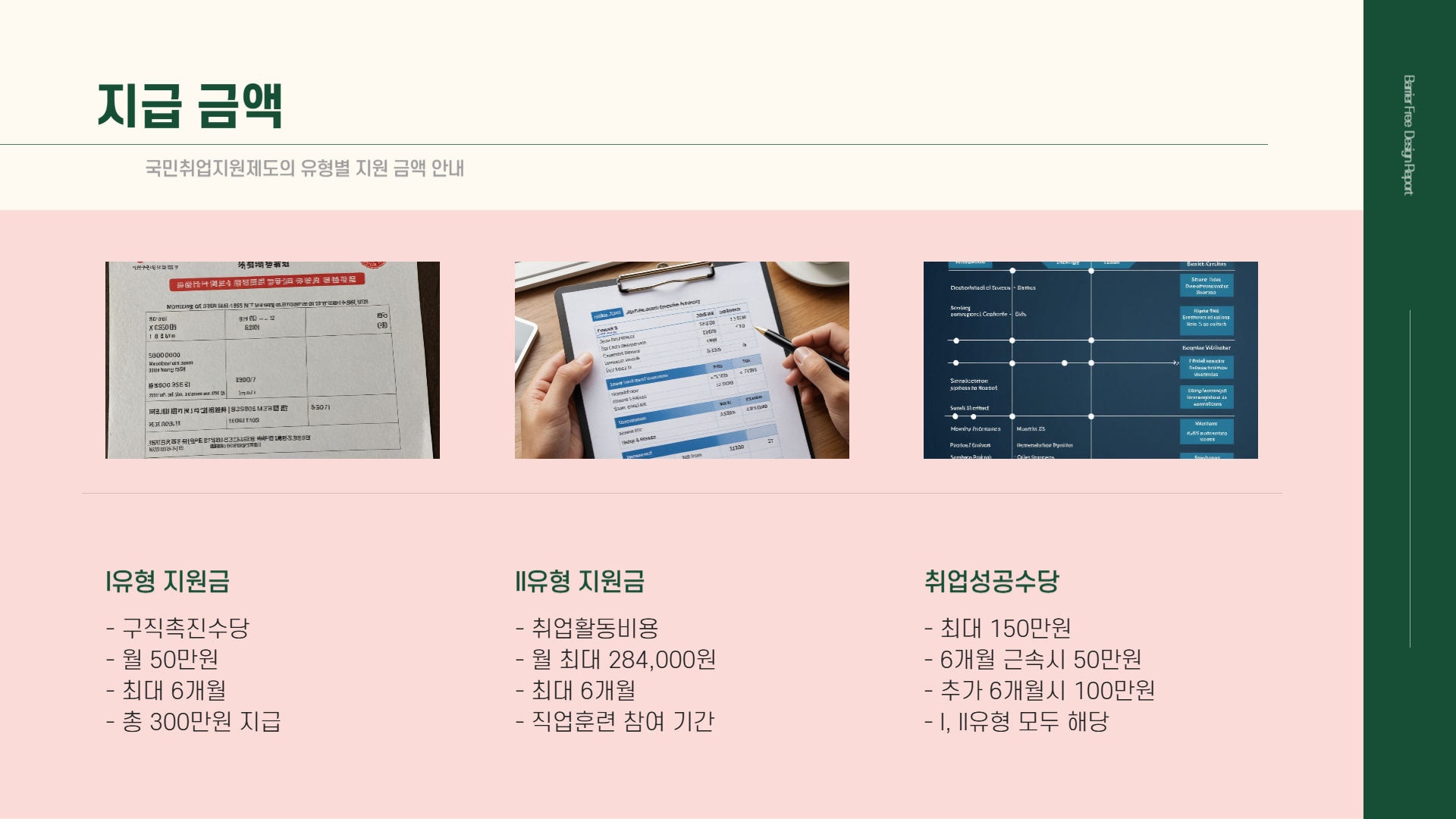 I유형: 구직촉진수당으로 매월 50만 원씩 최대 6개월간 총 300만 원이 지급됩니다. 추가로, 취업에 성공하여 일정 기간 근속할 경우 최대 150만 원의 취업성공수당이 지급됩니다. 이는 취업 후 6개월간 계속 근무 시 50만 원, 이후 추가 6개월 근속 시 100만 원이 지급되는 방식입니다.