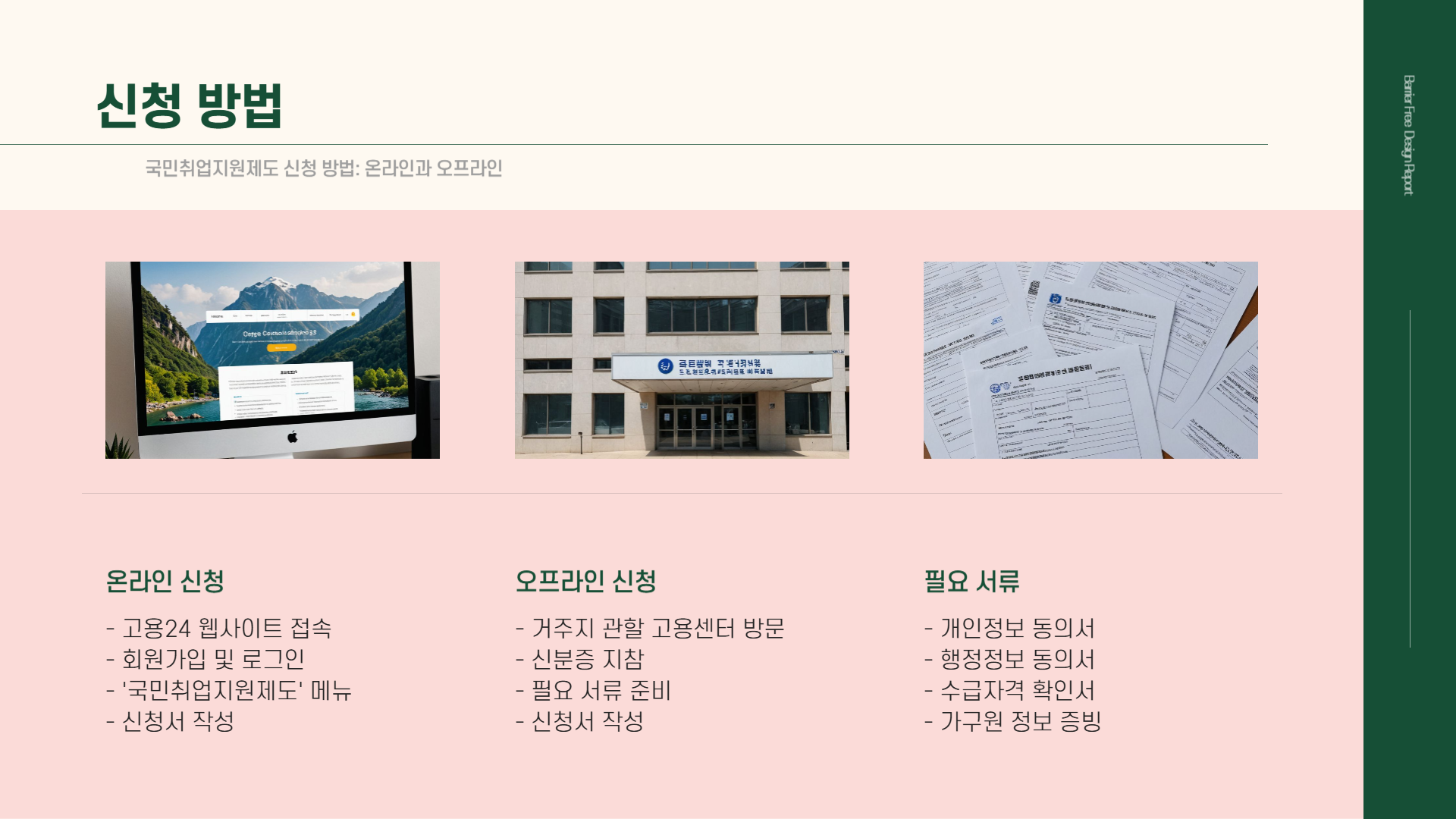 오프라인 신청을 원하시는 분들은 거주지 관할 고용센터를 방문하여 신청할 수 있습니다. 방문 전 필요한 서류를 미리 준비하여 가시면 보다 원활한 신청이 가능합니다. 고용센터 방문 시에는 신분증과 함께 아래의 필수 서류를 지참하시기 바랍니다.