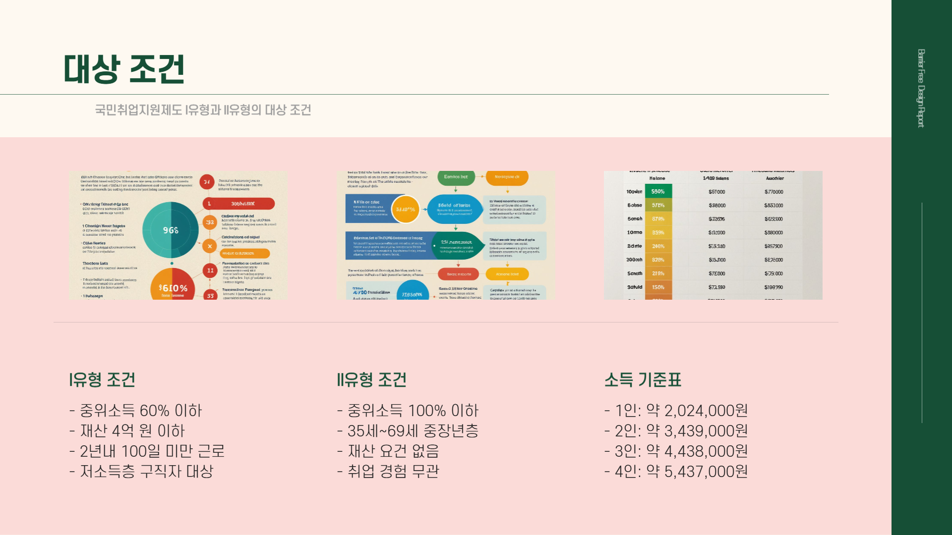 II유형: 중장년층(35세~69세) 구직자 중 가구 소득이 중위소득 100% 이하인 분들이 해당됩니다. 재산 요건은 따로 없으며, 취업 경험도 무관합니다.